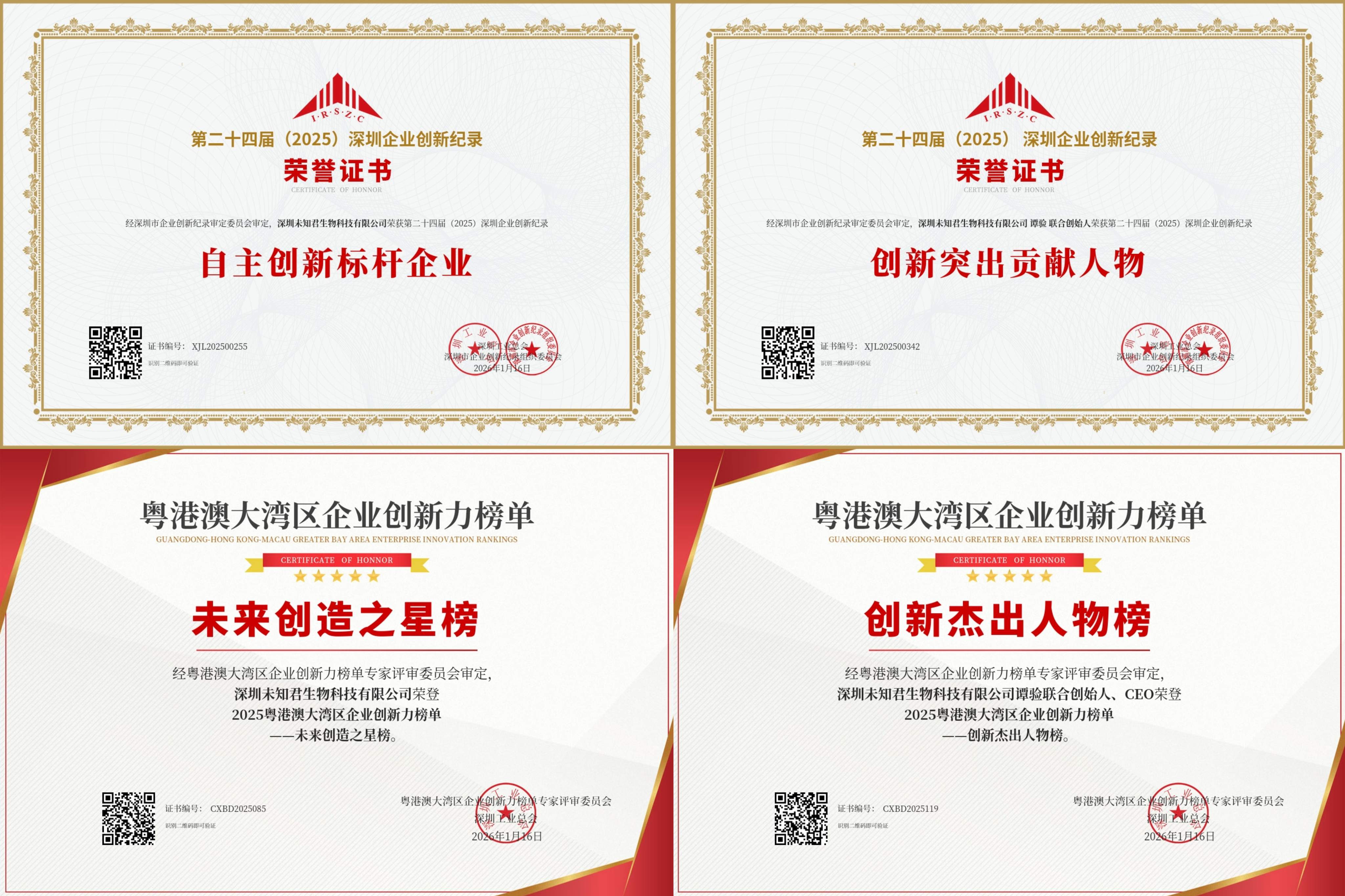 此次未知君斩获的荣誉奖项,覆盖深圳企业创新纪录与粤港澳大湾区企业创新力榜单两大权威体系,印证了公司在肠道微生态创新赛道的综合实力与引领地位。