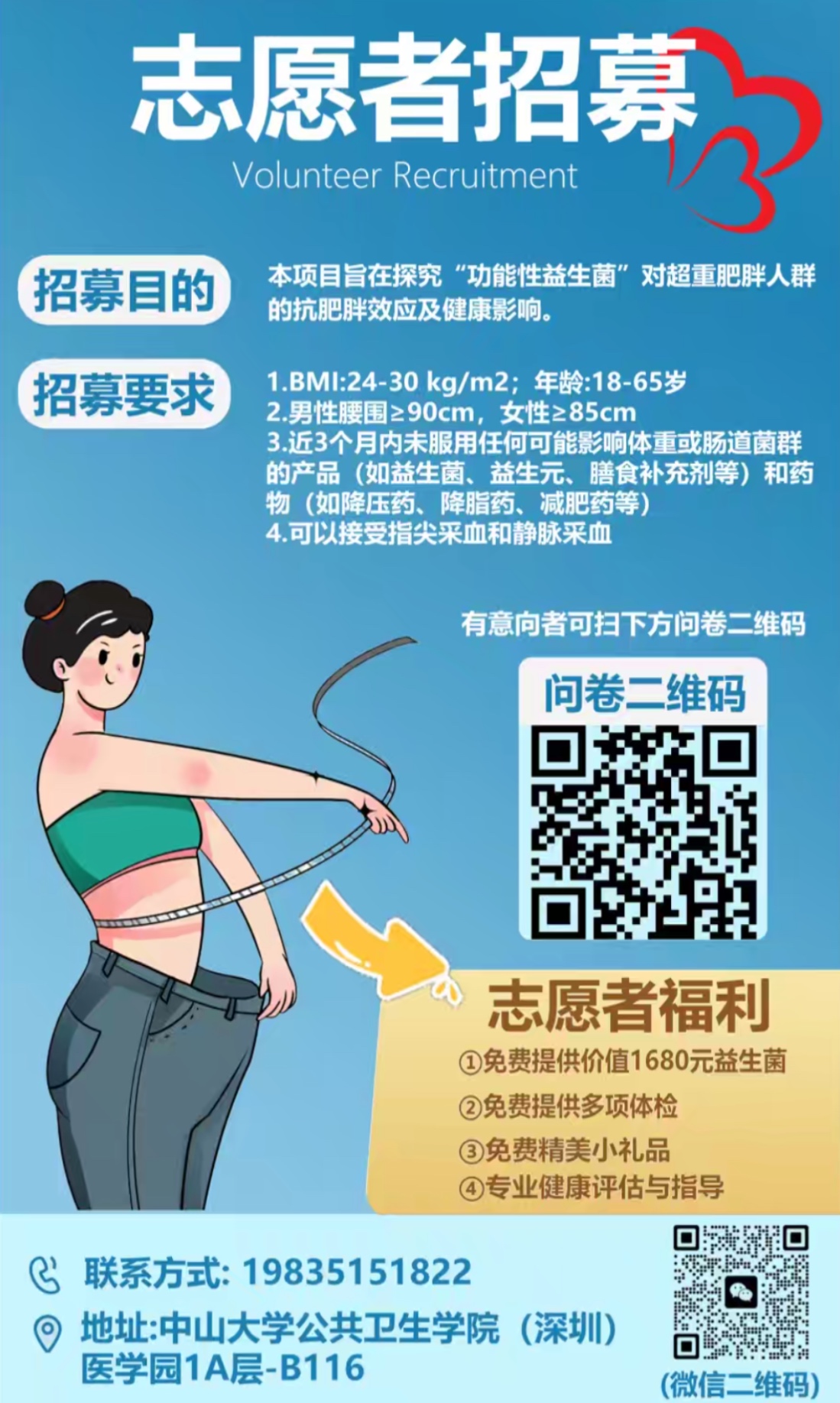 为深入研究XA-1416的临床价值,在深圳市科技重大专项的支持下,未知君与中山大学公共卫生学院(深圳)合作,围绕XA-1416开展随机双盲安慰剂对照的临床研究,用制药级的RCT方案,验证XA-1416在人体中的减脂效果和机制。目前,该项目的志愿者招募正在进行中,科研专家邀请深圳市民朋友报名参加,共同体验安全、健康、轻松减脂减重。